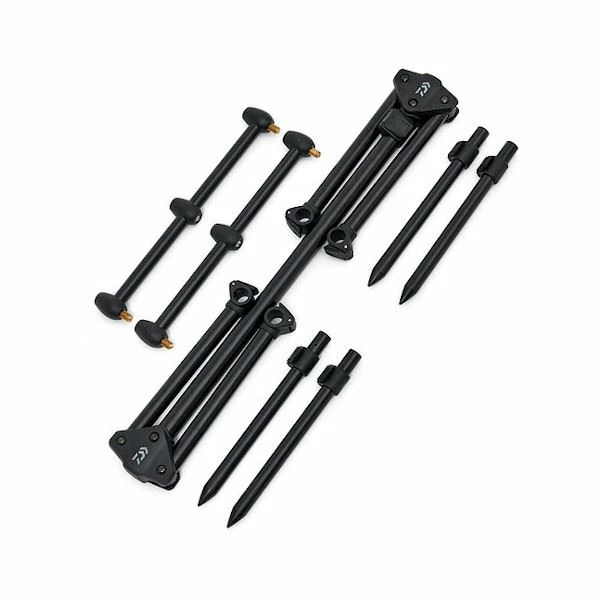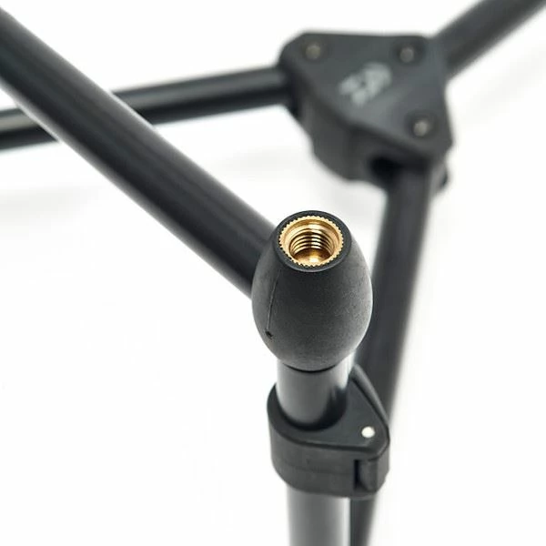The black widow low level rod pod is compact lightweight and simple to use. Manufactured from aluminium and with a matt black finish. The main frame goes up incredibly quickly and packs away into a neat organised storage bag for transport. The main goalpost banksticks are adjustable so you can fish low profile, or extend them to their full height for a bit more ground clearance.