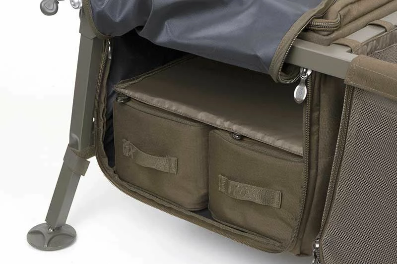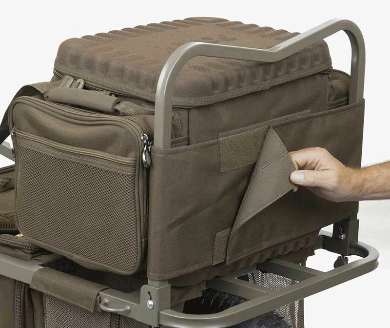 Improving upon the previous design with extra features and superior additions such as a handy under bag for easy storage. It also has a hard base and a zipped pocket to house a camouflaged waterproof rain cover which comes supplied as standard to fight off rust and ware whilst fishing. It has been built to allow anglers to fish ‘off of’ making it ideal for short-session anglers that like to keep mobile but is also equally as good for anglers that need to carry those essential extras!