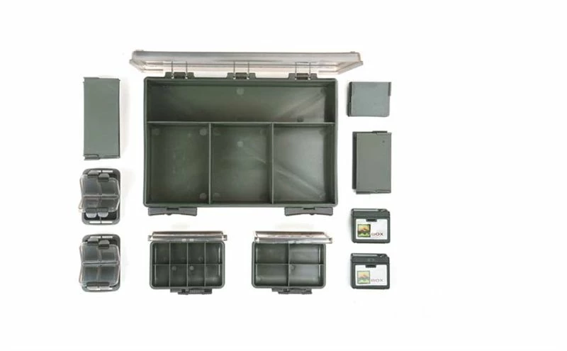 - The F-Box Deluxe Set is fully fitted with integral storage units which are designed to accommodate all formats of carp fishing tackle. The box itself is designed to maximise storage space and allow easy access to all types of tackle components. The high impact, injection moulded construction produces a rigid and hard wearing design which features waterproof sealed lids, long last hinges and reliable slide lock closure. The compartments are adjustable in size using the supplied sub dividers and the box comes fully fitted with the following components: