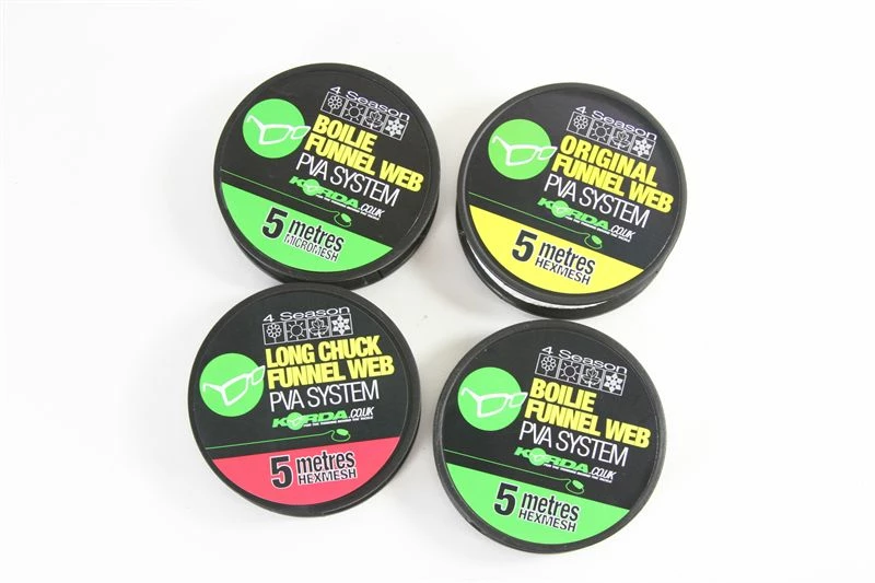 - Korda have redesigned all of the PVA system and refils making them more carpy, smaller and more economical. The Boilie System now has 7m of PVA on it, a new moulded outer tube with a special quick turn thread on the cap. Included inside the tube is a new look kompressa, with a soft touch handle. All systems are now colour coded to make choice easier. Boilie Funnel Web Systems and Refils are now colour coded in Green.