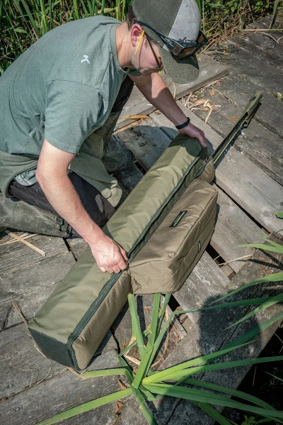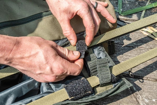 Take up to three made up outfits ready to go, along with all your bankwear and shelter along with you. Designed to take any shelter in the range, the large main compartment is separated from the others and closes with a drawstring top. The pouch for taking your outfits is padded and zipped but the tops remain out. There’s also a third outer side pocket for taking any landing net handles and bank sticks you might need.