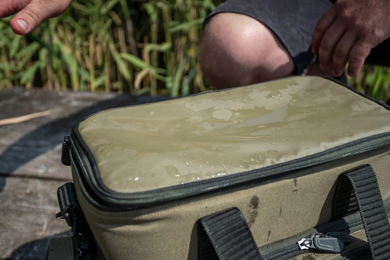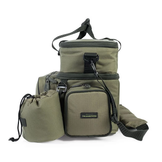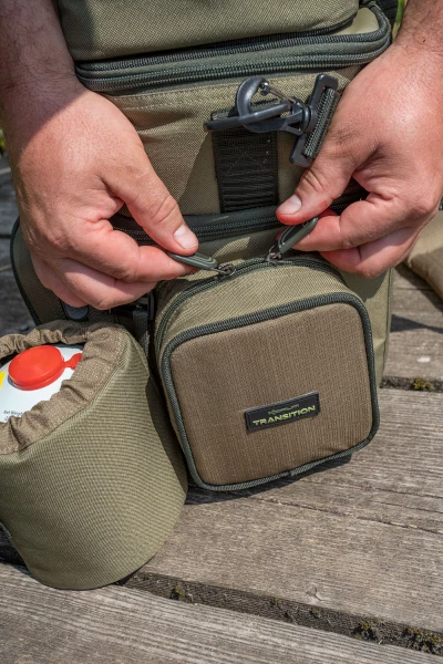 The two cooling compartments attach on top of each other and are separated by a large zip. There are two smaller zipped pockets either end and a large outer that runs the length of the bag. Perfect for taking tackle boxes or extra food and cooking gear to go with included gas canister bag that clips to the outside.