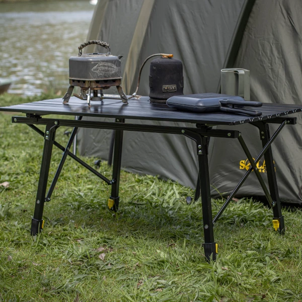 A great addition to Solars popular lightweight A1 aluminium bankware range. This smart black anodised table with folding legs is brilliant for jobs like outdoor dining and food prep. With each leg being individually adjustable, you can get these nice and level on uneven ground. The concertina style table top rolls up neatly for transport in dedicated carry bag.